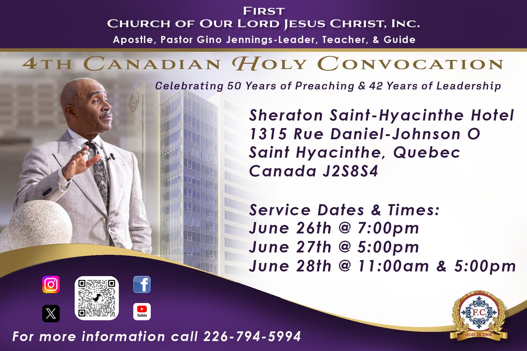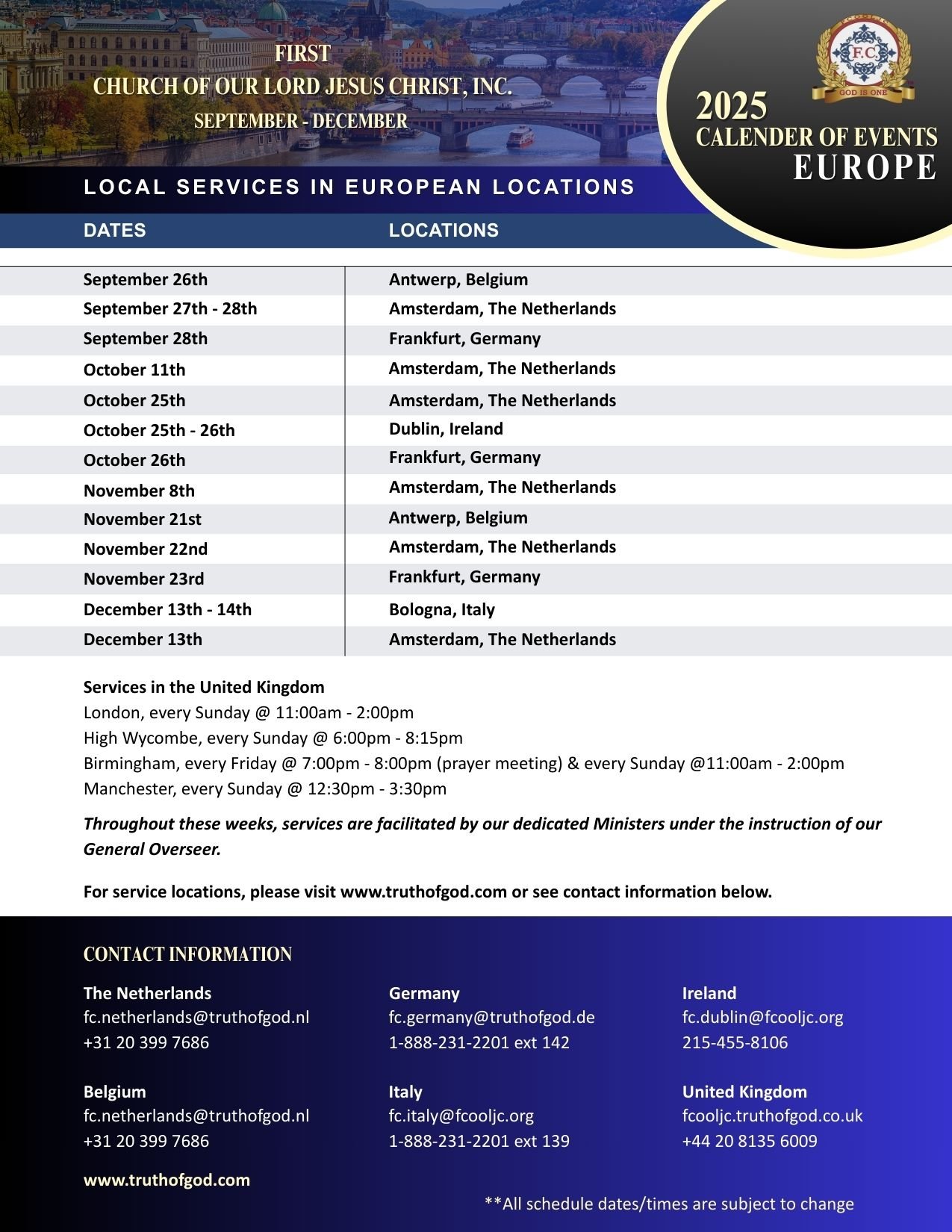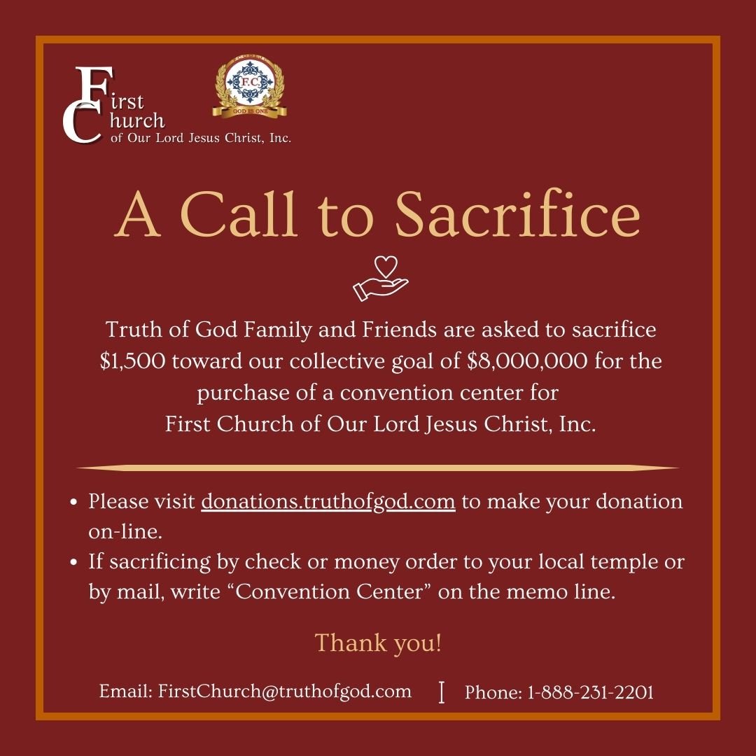 Brothers and sisters are prayerfully asked to sacrifice towards the purchase and renovation of our own First Church Convention Center. You may donate at the official church website: https://donations.truthofgod.com.